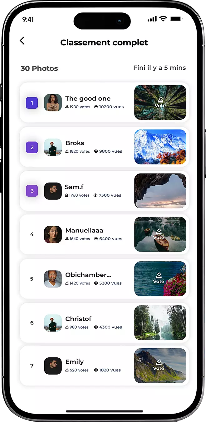 Prenez les commandes du classement ! Parcourez les catégories qui vous passionnent et analysez chaque création avec un œil d’expert. Ici, votre clic est une arme : en votant pour les clichés qui vous marquent, vous propulsez instantanément vos favoris vers le sommet. Ne restez pas spectateur, imposez vos coups de cœur et faites grimper les talents qui méritent d’être vus. Chaque vote redessine la hiérarchie en temps réel. Alors, qui dominera la galerie aujourd’hui ?